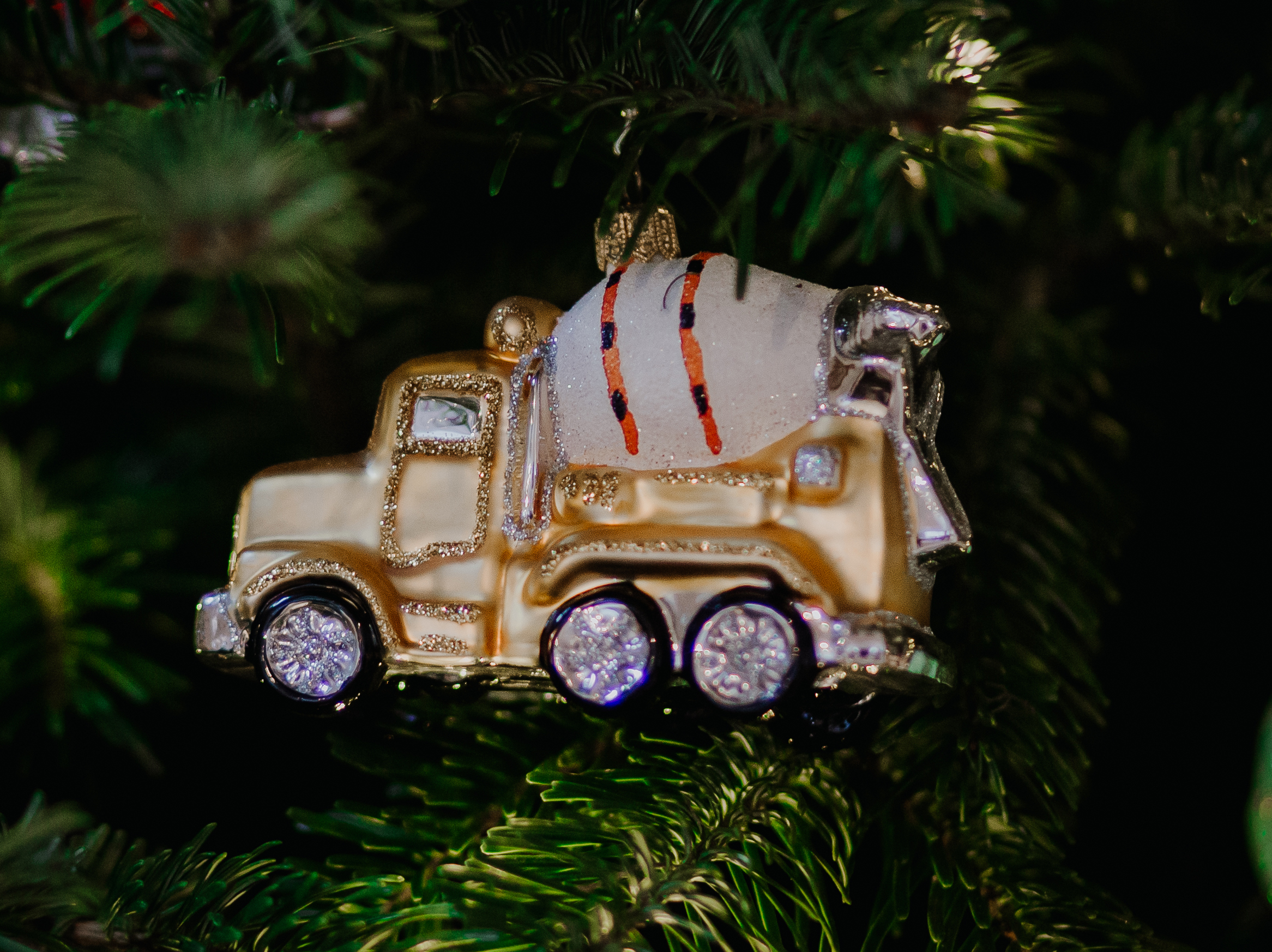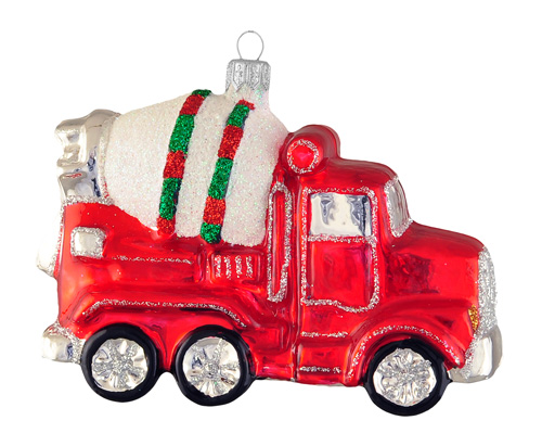 Betoniarka #F551 szklana ozdoba choinkowa. Wydmuchiwana i dekorowana ręcznie. Wysokość  7cm, szerokość 12cm.