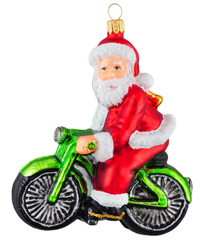 Mikołaj na rowerze #F489 Szklana Ozdoba Choinkowa. Wydmuchiwana i dekorowana ręcznie. Wysokość 12 cm
