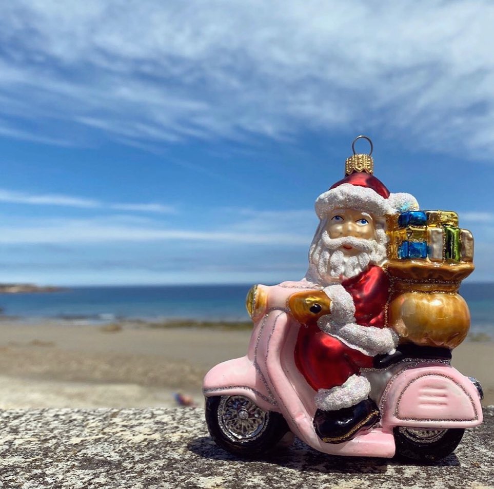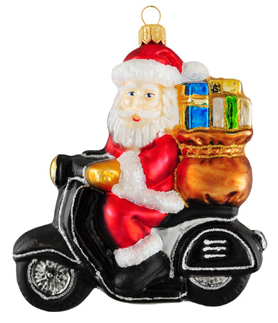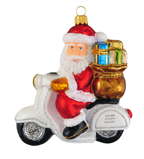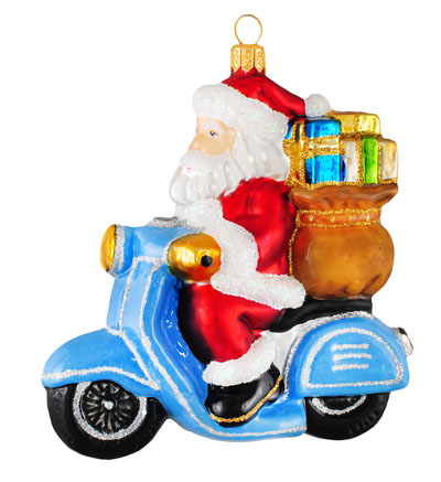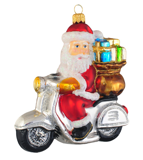 Mikołaj na skuterze#F490 Szklana Ozdoba Choinkowa. Wydmuchiwana i dekorowana ręcznie. Wysokość 12 cm