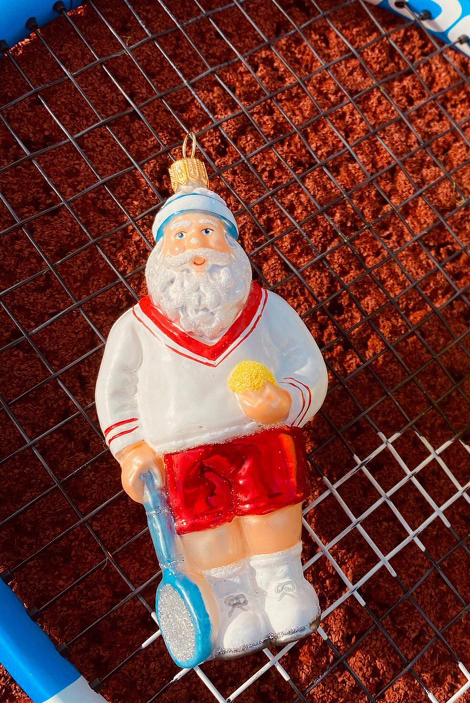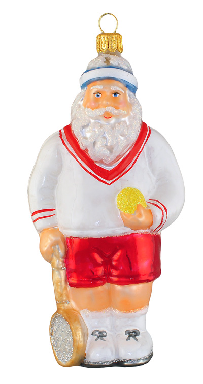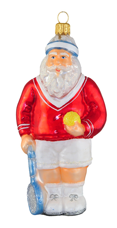 Mikołaj tenisista # F 707 Szklana Ozdoba Choinkowa. Wydmuchiwana i dekorowana ręcznie. Wysokość 13,5 cm.