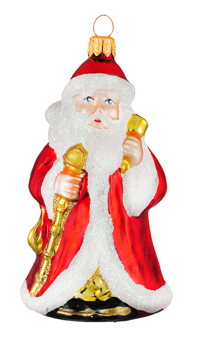 Mikołaj w czerwonym płaszczu mały  # F027 Szklana Ozdoba Choinkowa. Wydmuchiwana i dekorowana ręcznie. Wysokość 10 cm.