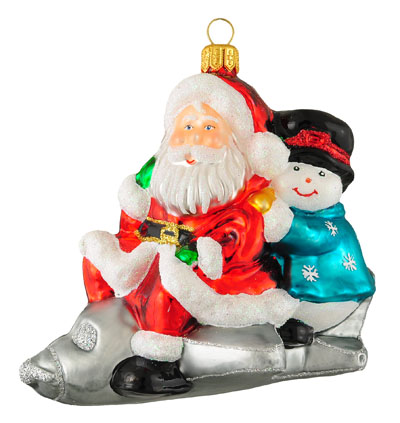 Mikołaj z bałwankiem na samolocie # F534 Szklana Ozdoba Choinkowa. Wydmuchiwana i dekorowana ręcznie. Wysokość 11,5 cm.