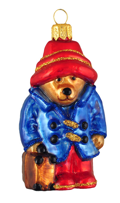 Miś z walizką # F602 Szklana Ozdoba Choinkowa. Wydmuchiwana i dekorowana ręcznie. Wysokość 9 cm.