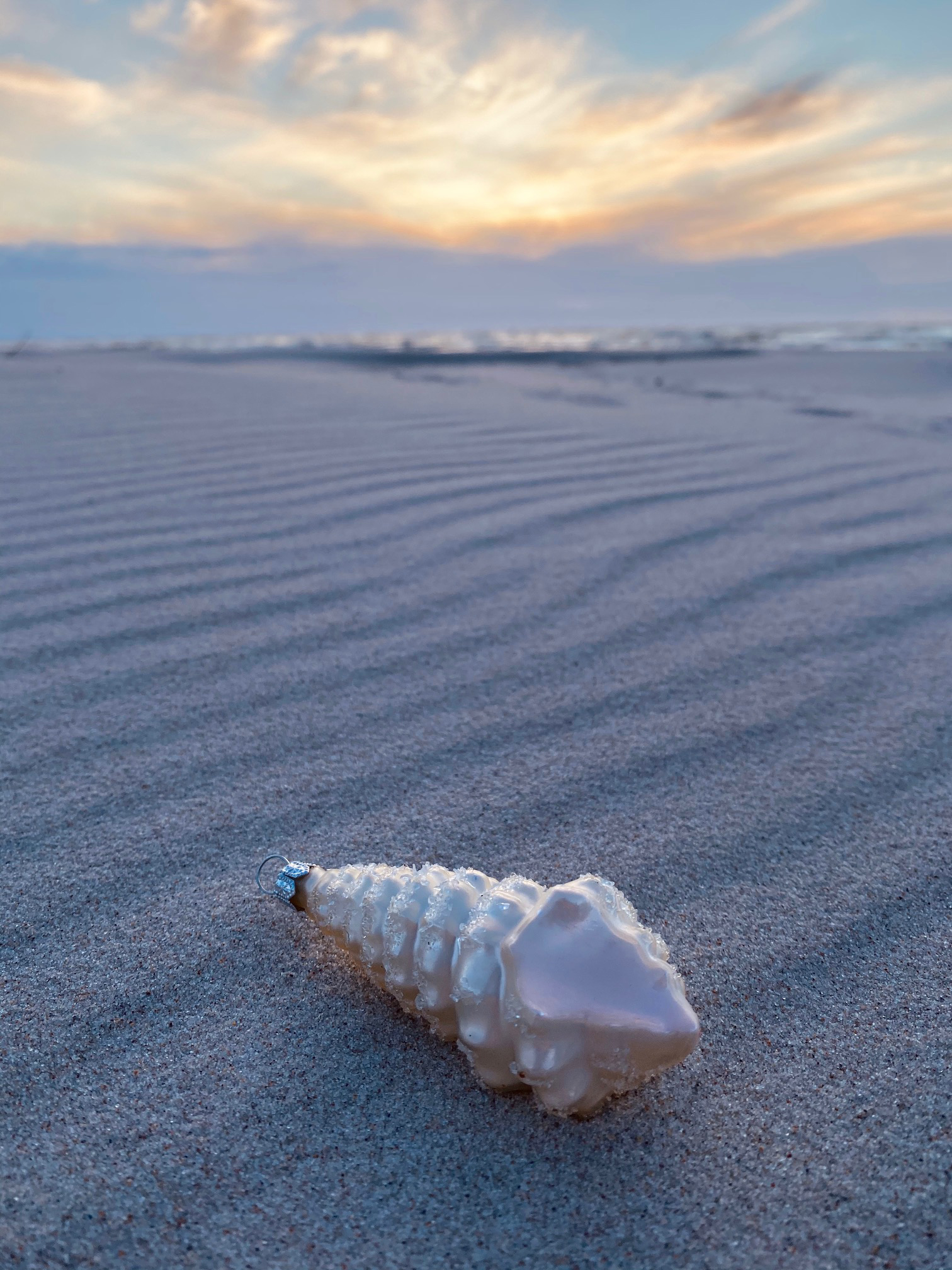 Muszla # F665 Szklana Ozdoba Choinkowa. Wydmuchiwana i dekorowana ręcznie. Wysokość 9 cm.