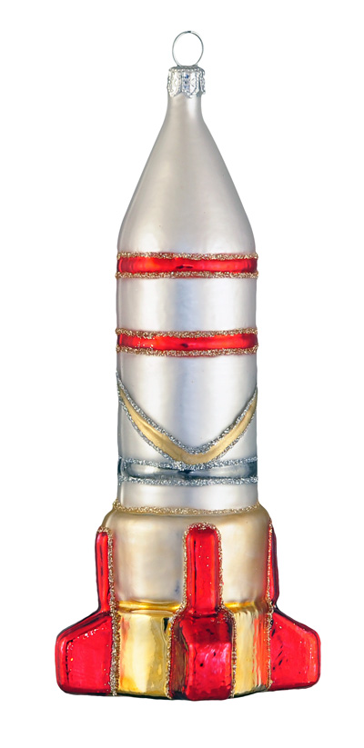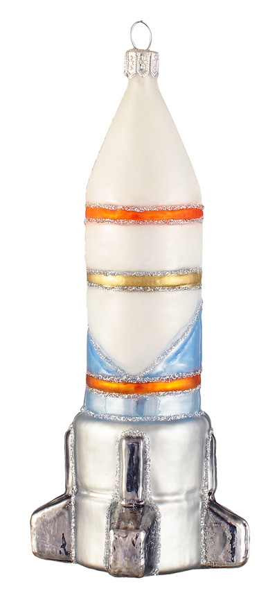 Rakieta kosmiczna # F696 Szklana Ozdoba Choinkowa. Wydmuchiwana i dekorowana ręcznie. Wysokość 15 cm.