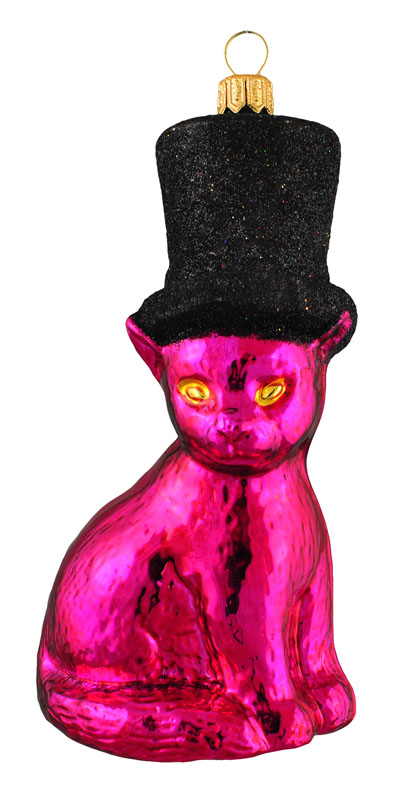 Różowy kot # F454 Szklana Ozdoba Choinkowa. Wydmuchiwana i dekorowana ręcznie. Wysokość 12,5 cm.