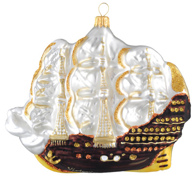 Żaglowiec # F229 Szklana Ozdoba Choinkowa. Wydmuchiwana i dekorowana ręcznie. Wysokość 11 cm.